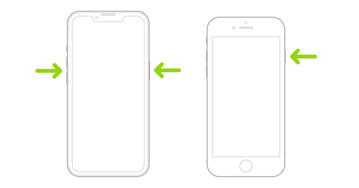 - Ha bevágásos/Dynamic Island-es iPhone-ja van, nyomja meg és tartsa lenyomva a hangerőszabályzó gombot és az oldalsó gombot, amíg meg nem jelenik a kikapcsolás csúszka. Ha iPhone-ján van Kezdőlap gomb, nyomja meg és tartsa lenyomva az oldalsó gombot, amíg meg nem jelenik a kikapcsolás csúszka.