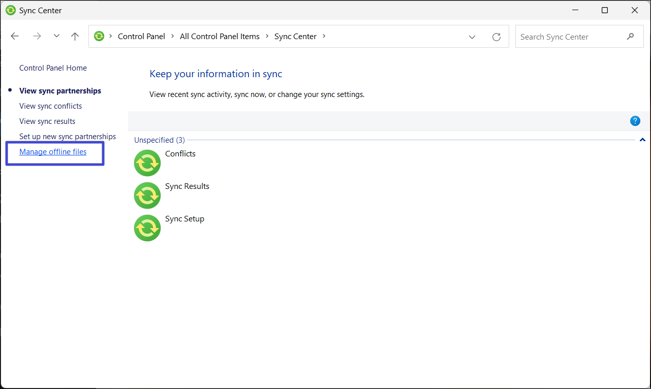4. A szinkronizáló ablak bal oldalán kattintson a „Offline fájlok kezelése. ””