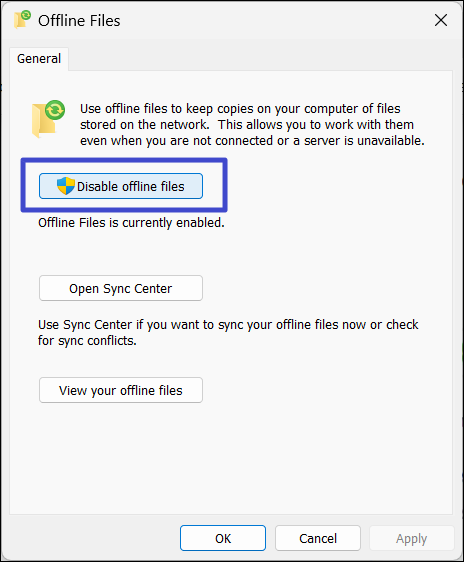 4. módszer: Kapcsolja ki a rendszer offline fájljait
