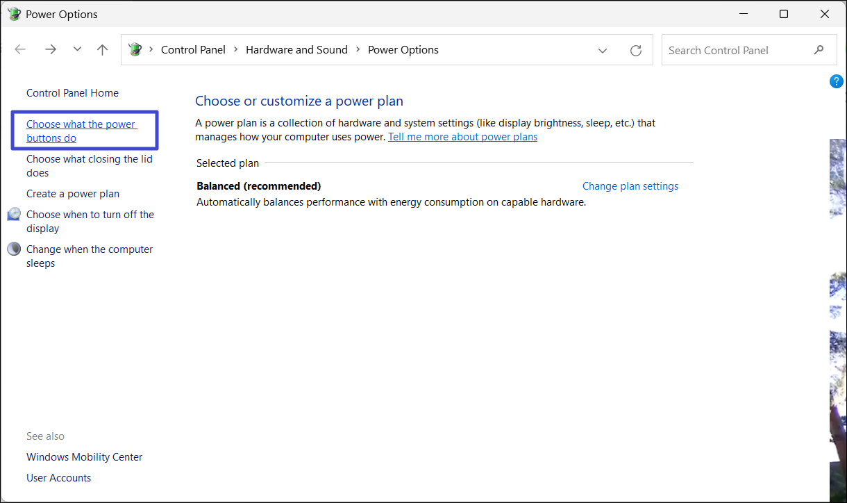 2. Kattintson a „Válassza ki, mit csinál a bekapcsoló gombok”A bal oldali panelen.