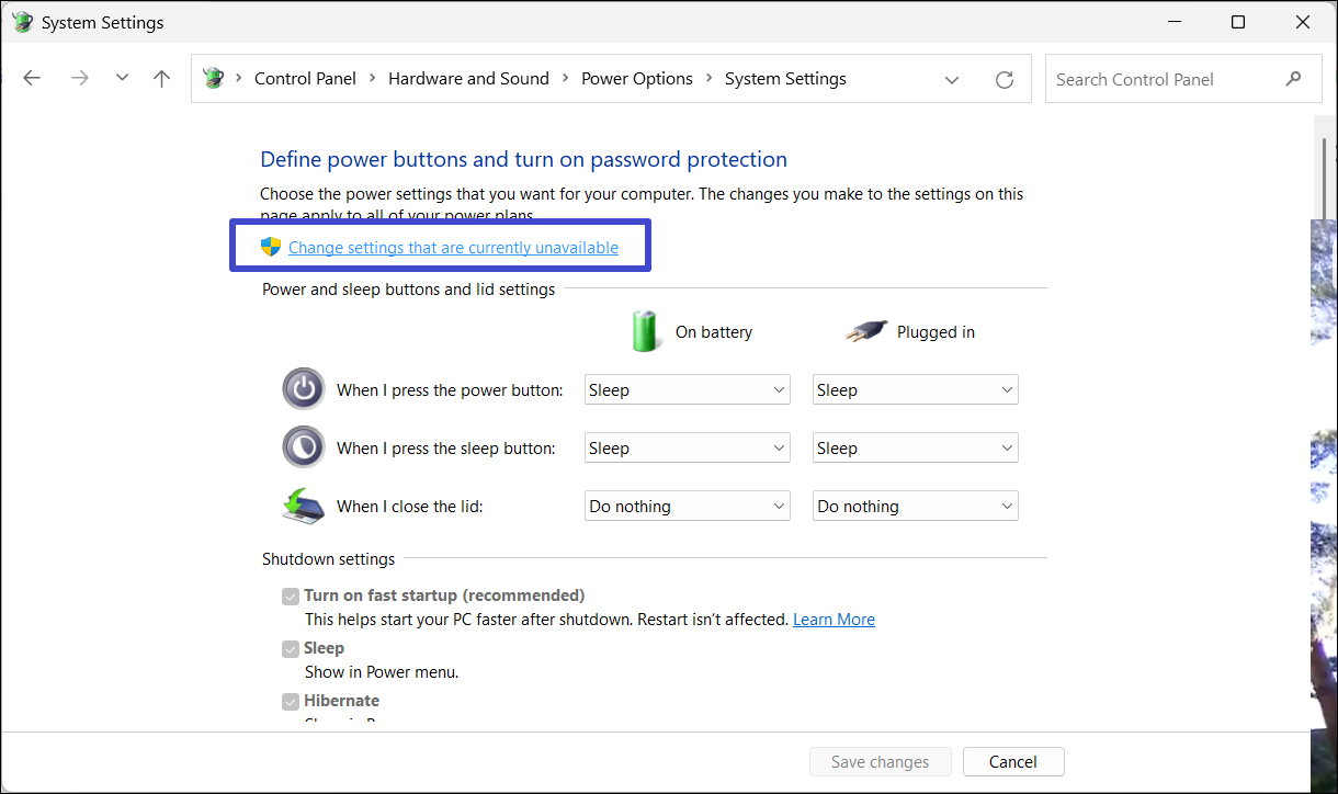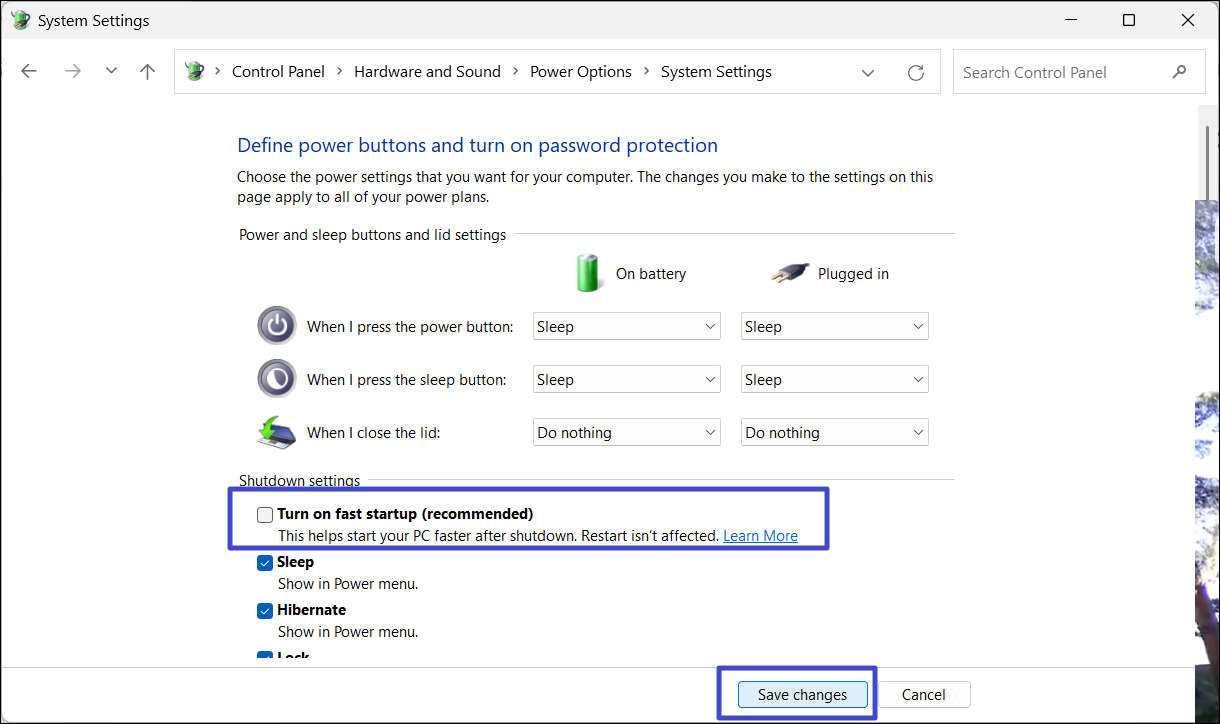 4. Most törölheti a jelölést a doboz mellettKapcsolja be a gyors indítást (ajánlott)”És kattintson a“Mentse el a változásokat ”-