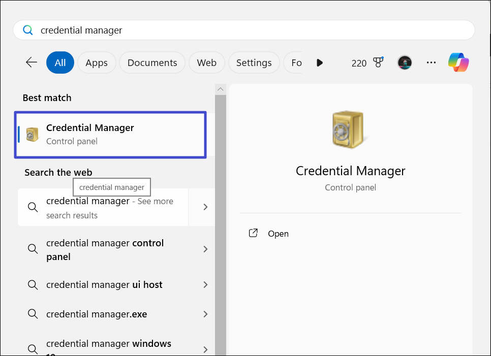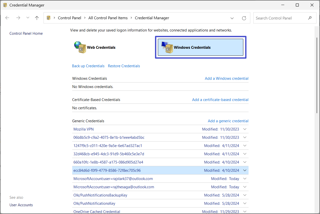 5. Nyissa meg„Hitelesítő igazgató”Ismét és menj “Windows hitelesítő adatok. ””