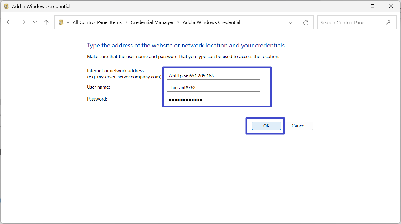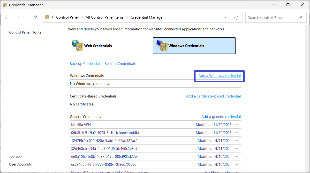 6. Kattintson a „Adjon hozzá egy Windows hitelesítő anyagot„.