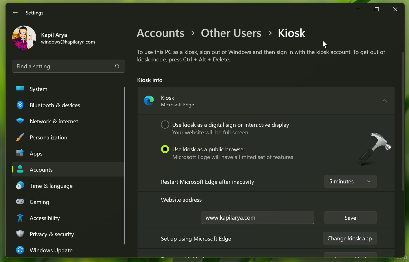 5. A kioszk mód újrakonfigurálása. Kerüljön ki a kioszk módból, és indítsa újra az eszközt. Távolítsa el a Kioszk felhasználói profilját teljesen. A kioszk mód újrakonfigurálása a Beállítások> Fiókok> Család és más felhasználók> Kioszk beállítása.
