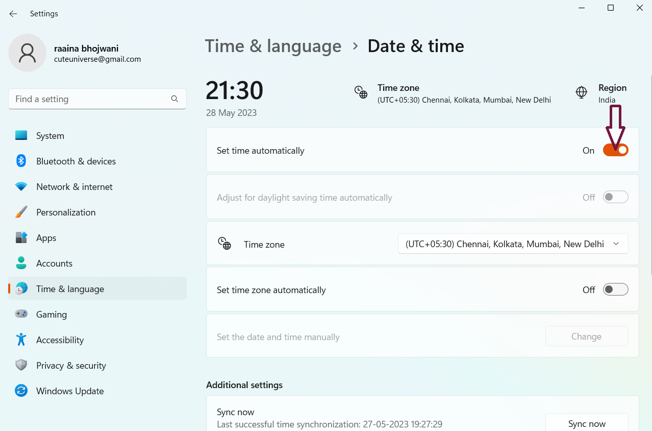 Ha a rendszer dátuma helytelen, akkor váltsonÁllítsa be az időt automatikusan-hozle- Ezután kattintson a gombraÁllítsa be a dátumot és az időt manuálisanÉs akkor változtassa meg.