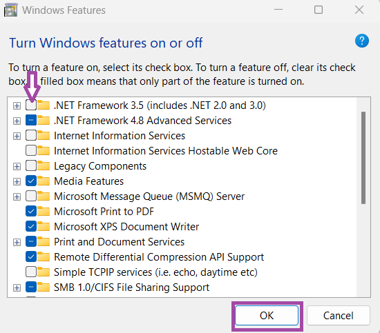 - Törölje a kijelölést.Net Framework 3.5> kattintsonRENDBEN.