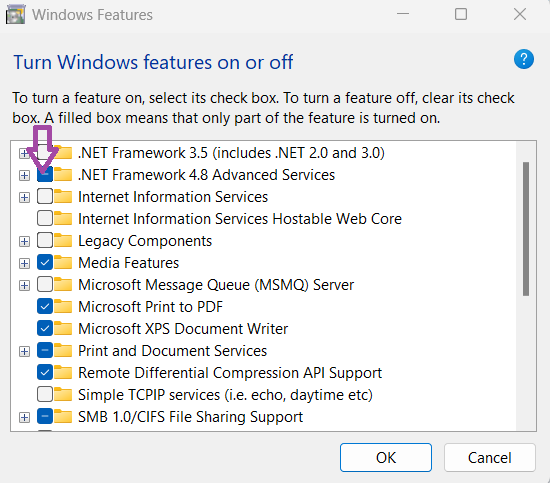 - Törölje a kijelölést.NET-keretrendszer 4.8 speciális szolgáltatásokdoboz. (lehet, hogy .NET Framework 4.6 vagy újabb), majd kattintson az OK gombra.
