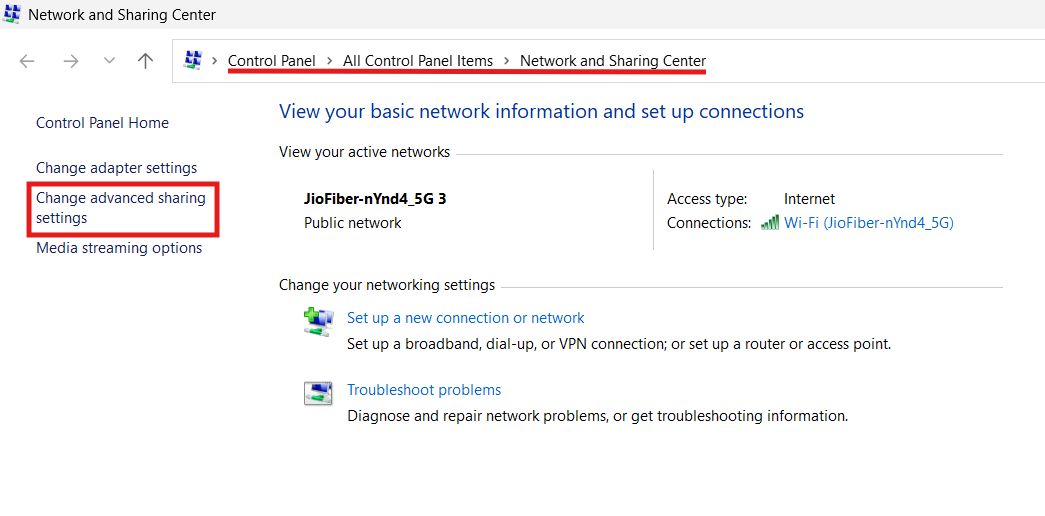 2. Kattintson a Hálózati és megosztási központ, majd a Speciális megosztási beállítások módosítása elemre.