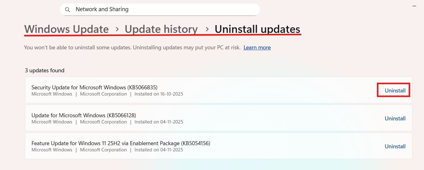 2. Keresse meg és távolítsa el a legutóbbi biztonsági frissítéseket, amelyek a problémát okozhatták.