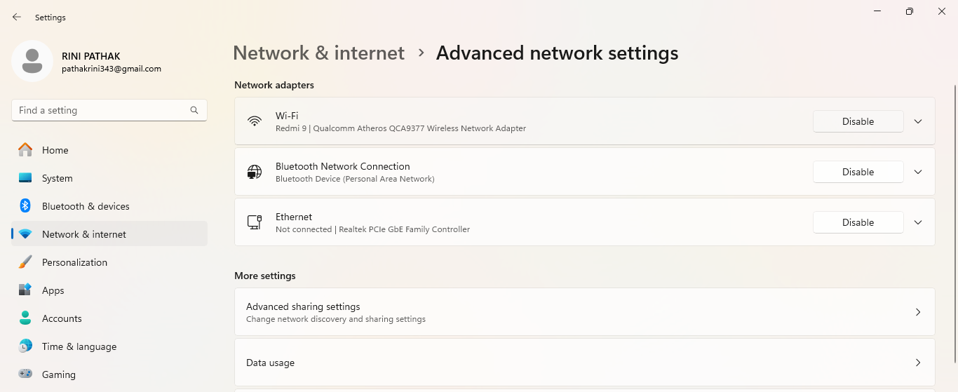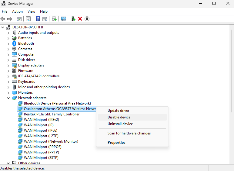 2. lépés-Másodszor, a hálózati adapterek alatt válassza a Letiltást a Wi-Fi mellett. Körülbelül egy perc múlva válassza az Engedélyezés lehetőséget.