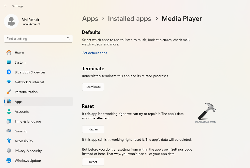 1. lépés-Először nyissa meg a Beállítások > Alkalmazások > Telepített alkalmazások > Windows Media Player lehetőséget.