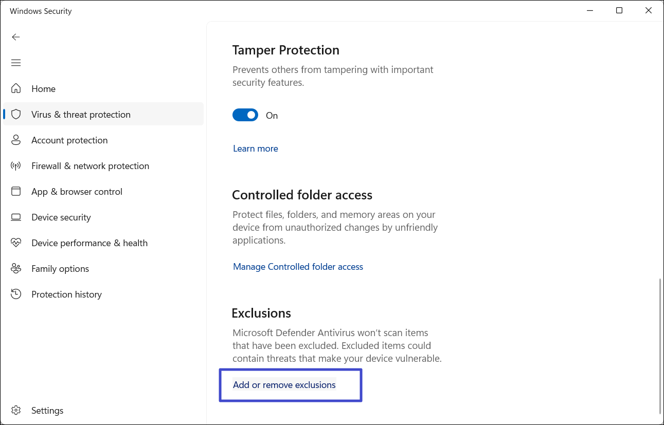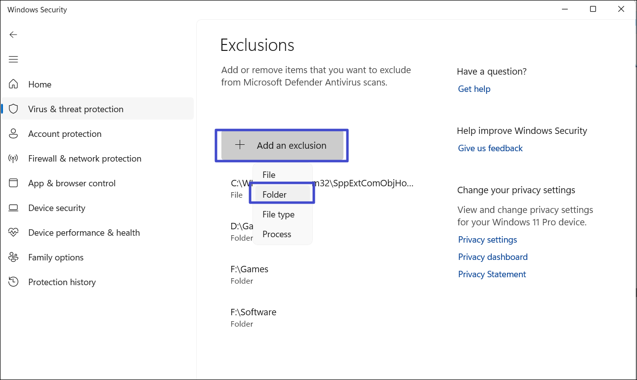 Ha bízik a fájlban és annak forrásában, akkor hozzáadhatja a fájlt vagy a teljes mappát, amely tartalmazza a fájlt a Windows Security kizárási listájához.