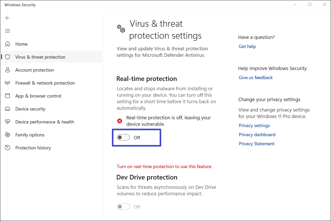 4. Kapcsolja ki a „Valós idejű védelem„Váltás a Windows Security alkalmazás letiltásához.