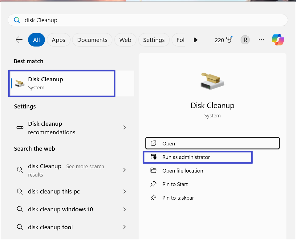 1. Írja be a „Lemeztisztítás”A Windows keresésben, és kattintson az első eredményre.
