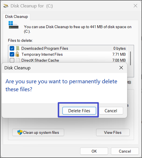 6. Amikor megjelenik a megerősítő párbeszédpanel, kattintson a “Fájlok törlése„.