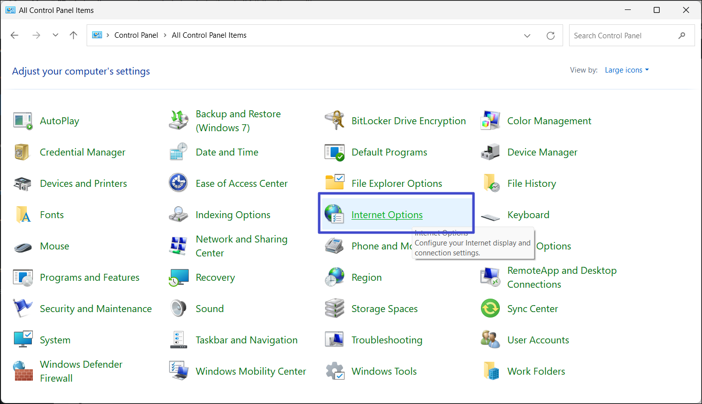 2.Nagy ikonokÉs kattintson a „Internetes lehetőségek„.