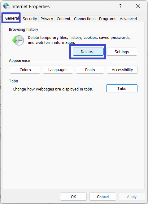 3. Az internetes beállítások ablakban váltson aÁltalánosFület, és kattintson a „Töröl…"A böngészési előzmények szakasz alatt.