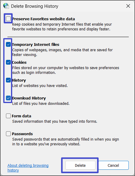 5. Ezután ellenőrizze a „Ideiglenes internetes fájlok és webhelyfájlok, sütik és weboldaladatok, előzmények, "és "Töltse le az előzményeket ”Opciók.