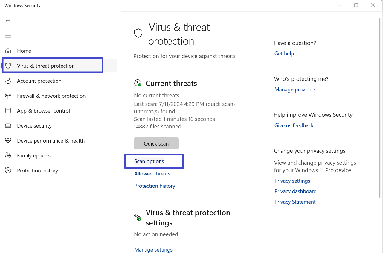 2.Vírus és fenyegetésvédelem”Szakasz és kattintson a“Szkennelési beállítások ”-