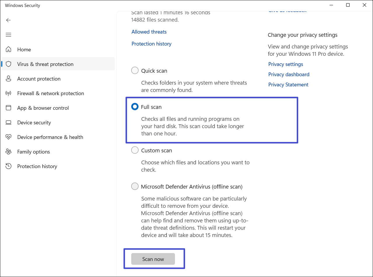 3. Válassza ki a „Teljes beolvasás”Opció, és kattintson a“Szkenneljen most„.