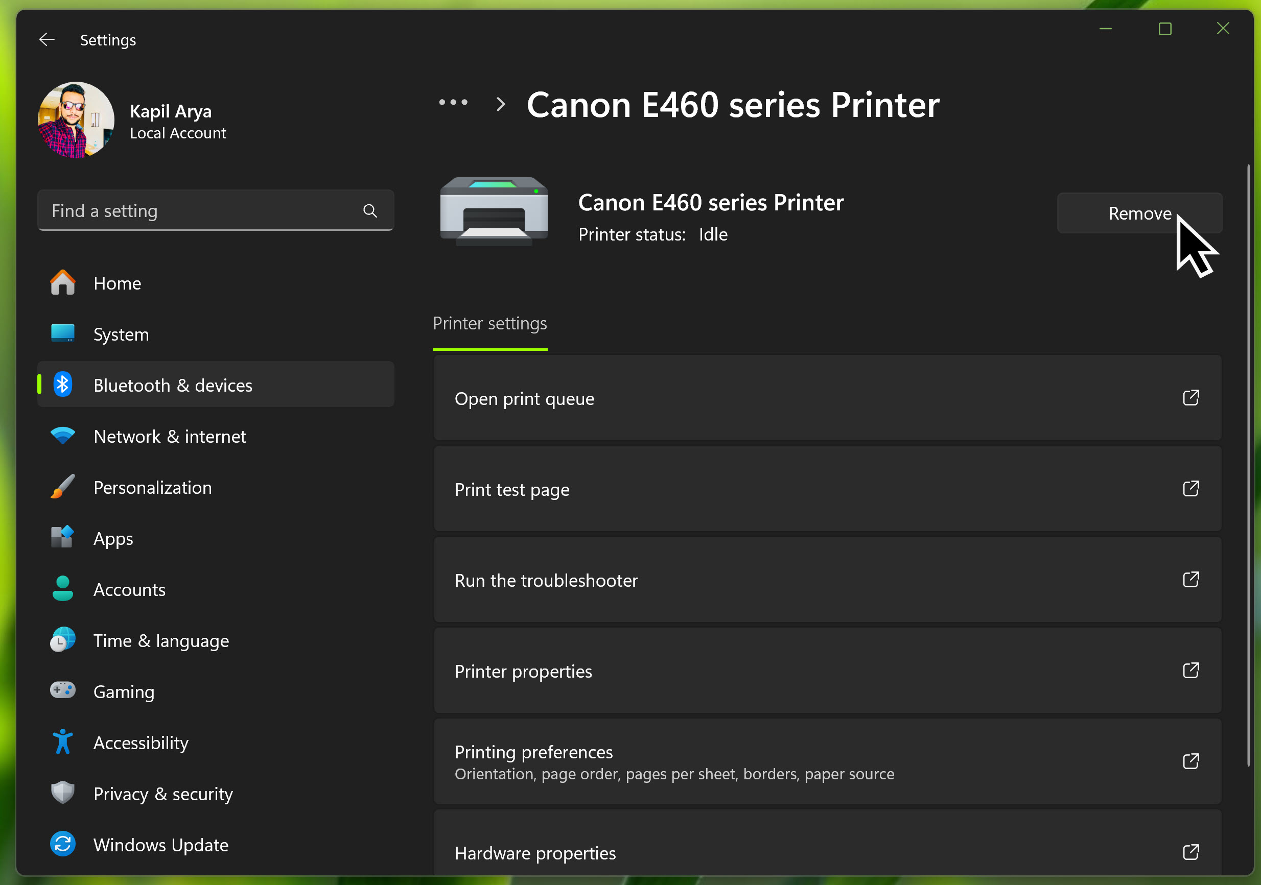 Nyissa meg a Beállítások alkalmazást, lépjen a Bluetooth és eszközök > Nyomtató menüpontra, majd válassza ki a nyomtatót.