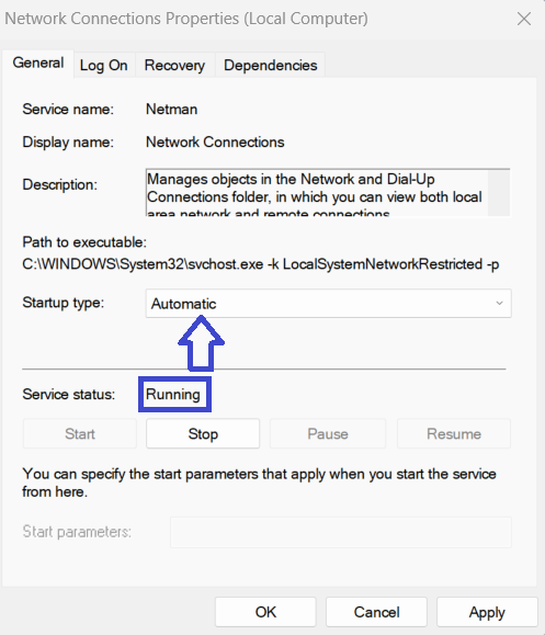 6. A szolgáltatás állapotának futtatnia kell. Ha nem, kattintson a Start elemre.
