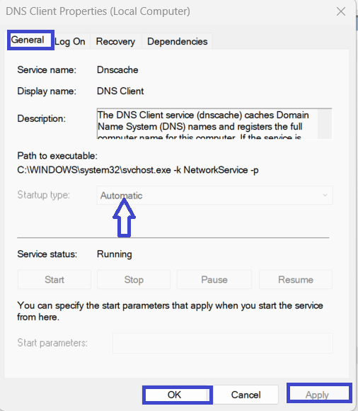 6. Kattintson az Általános lapra> Az indítási típus beállítása automatikus értékre.
