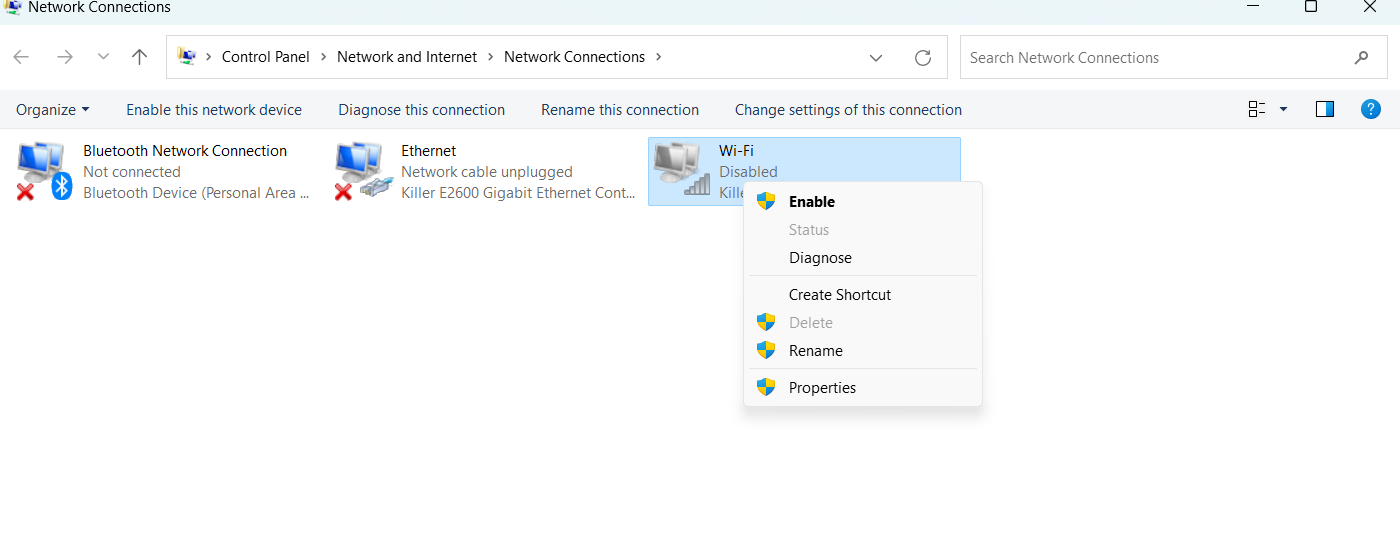 2. Kattintson a jobb gombbal a Wi-Fi-re> Válassza az Engedélyezés lehetőséget.