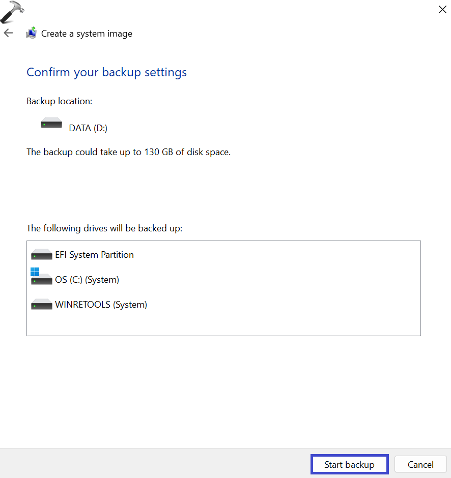 5. Kattintson a „Indítsa el a biztonsági mentést” a biztonsági mentési folyamat elindításához, és a Windows teljes rendszerképet hoz létre az Ön beállításai alapján.