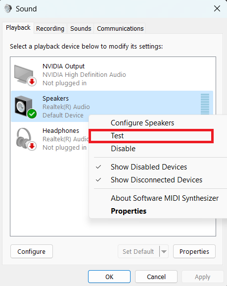 - Ismét kattintson a jobb egérgombbal az eszközre, és válassza kiTesztopció annak ellenőrzésére, hogy működik -e.