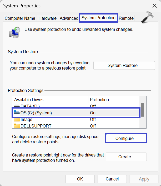 4. Ezt követően kattintson a „Konfigurálás5. Megjelenik egy System Protection for Windows (C:) párbeszédpanel. Kapcsolja be aKapcsolja be a rendszervédelmet” opciót.