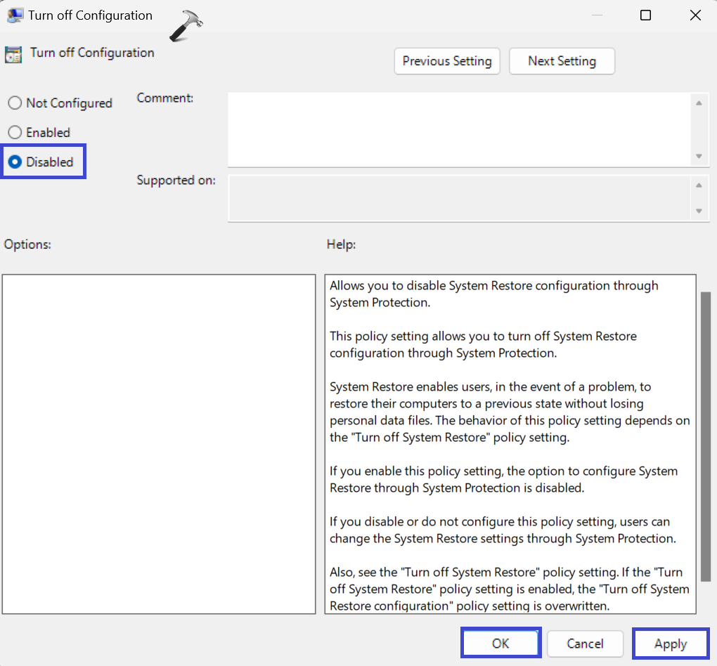 1. megoldás: Javítsa ki a Windows 11 rendszerben kiszürkült Rendszer-visszaállítást a Csoportházirend-szerkesztővel