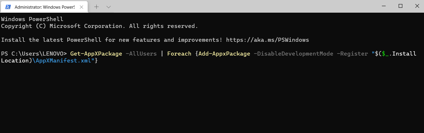 Get-AppXPackage -AllUsers | Foreach {Add-AppxPackage -DisableDevelopmentMode -Register "$($_.InstallLocation)AppXManifest.xml"}
