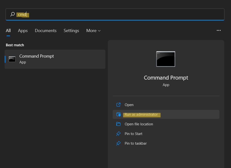 1. elsősorban írja beCMDaKeresésTAB, majd nyissa megParancssorKattintássalFuttasson adminisztrátorként- Ha a felhasználói fiókvezérlés kéri, kattintson a gombraIgen-