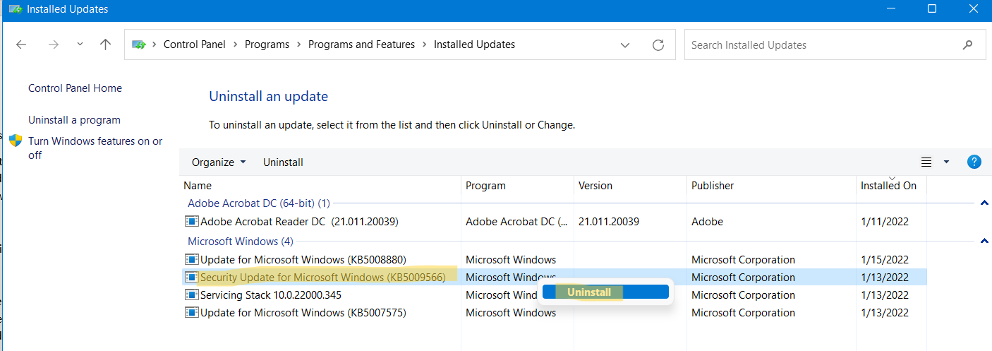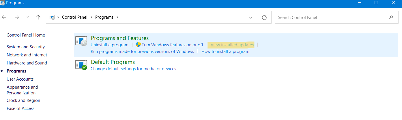 3. AProgramok és szolgáltatásokfül, kattintson a gombraA telepített frissítések megtekintése-