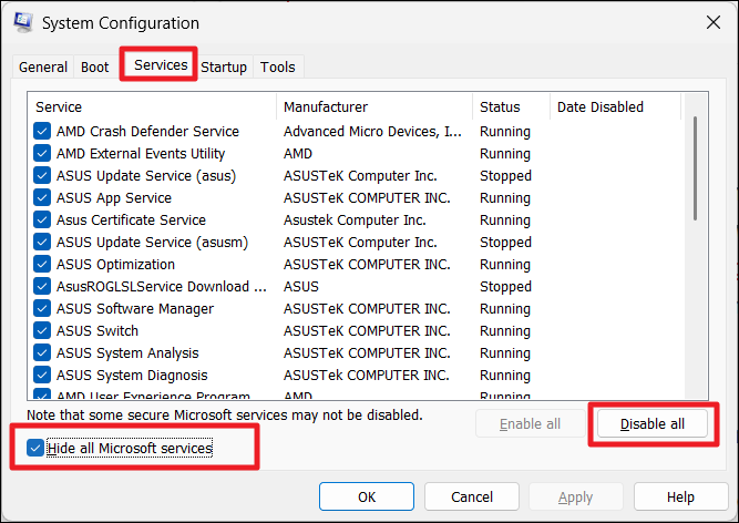 2. Menj a “Szolgáltatások ”fül, ellenőrizze a "Elrejtse az összes Microsoft szolgáltatást", És kattintson a"Tiltsa le az összeset„.