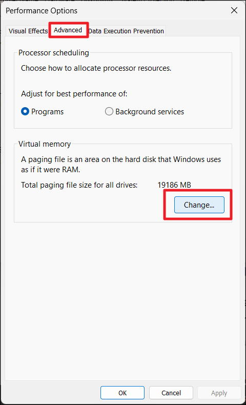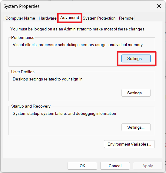 3. aFejlettfül, kattintson a „Beállítások”Gomb a teljesítmény szakasz alatt.