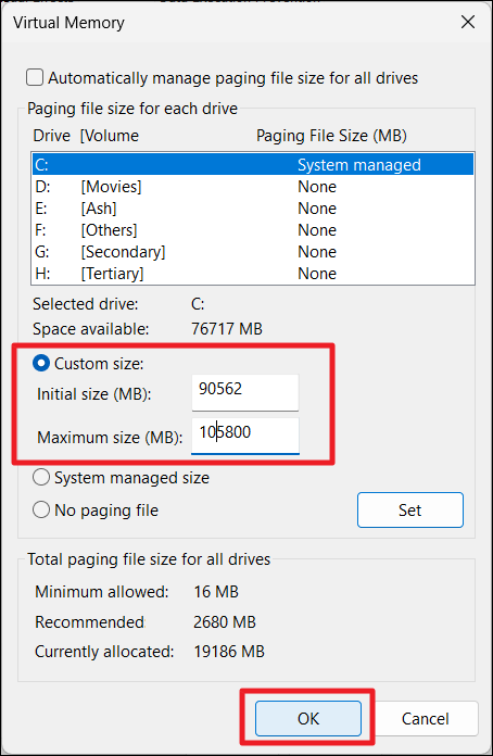 6. Ezután válassza ki a „Egyedi méret”Opció és adja meg aKezdeti méret (MB)ésMaximális méret (MB)a virtuális memóriádhoz.
