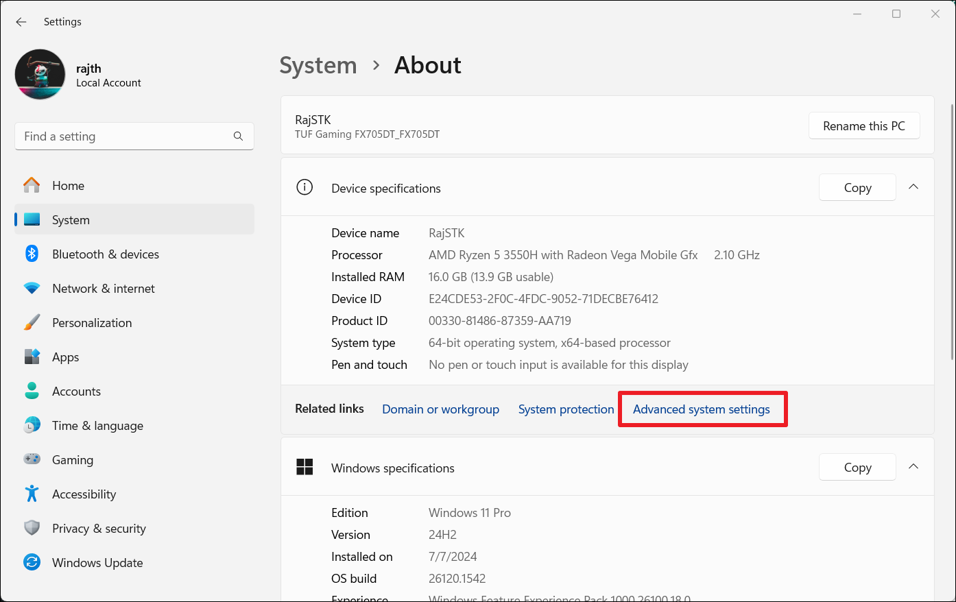 2. A kb. Oldalon kattintson a “Fejlett rendszer tulajdonságai„.
