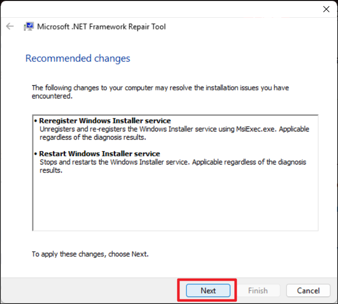 4. Amikor az eszköz megmutatja az ajánlott változtatásokat, kattintson a „Következő- hogy alkalmazzák őket.