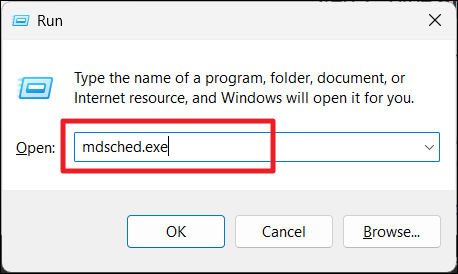 1. Nyomja megGyőzelem+R -tólA futópálya megnyitásához. Beírmdsched.exeÉs megütBeírA Windows memória diagnosztikájának elindításához.