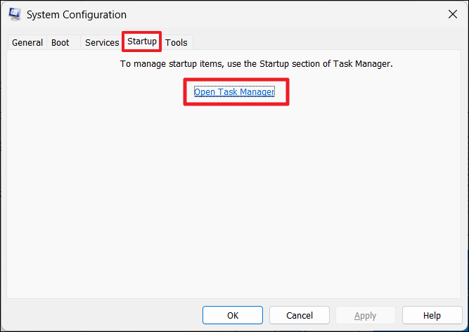 3. Ezután költözz a “Indulás- Kattintson kattintson a "Nyissa meg a feladatkezelőt„.