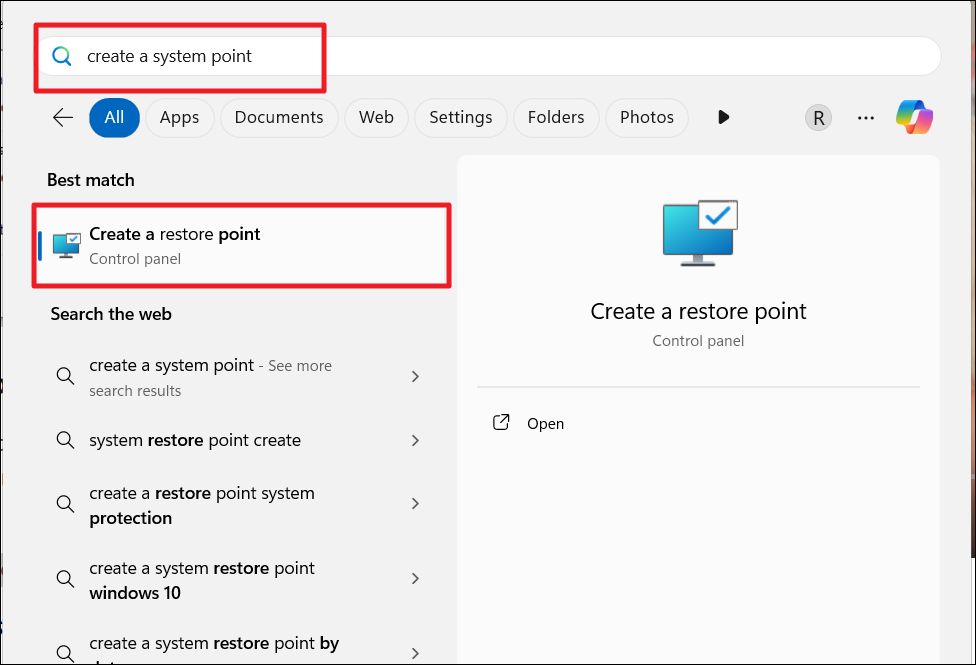 1. Keresse meg a „Hozzon létre egy visszaállítási pontot”És nyomja meg az Enter gombot.