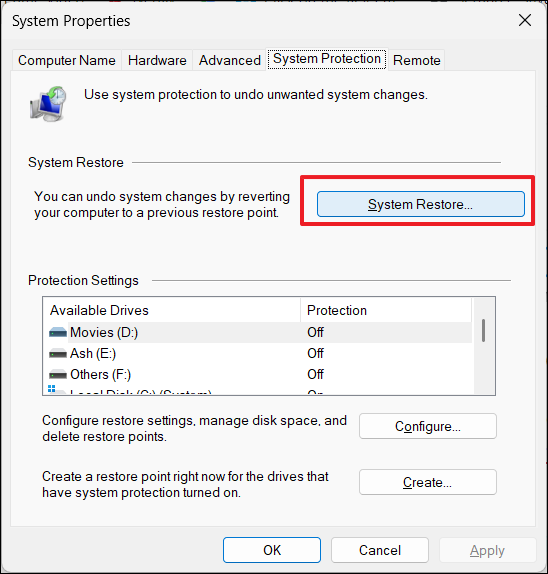 2. A rendszervédelem alatt kattintson a „Rendszer -visszaállítás„.