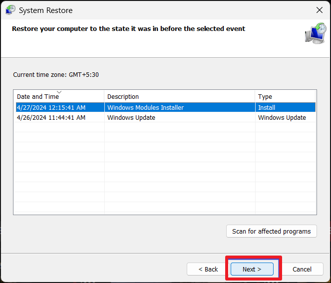 3. Válasszon egy visszaállítási pontot, és kattintson a “Következő„.