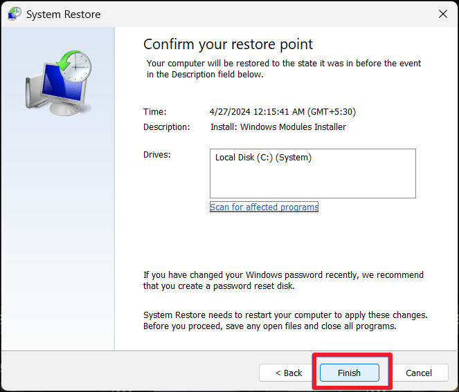 4. A visszaállítási pont megerősítése után kattintson a „Befejez„.