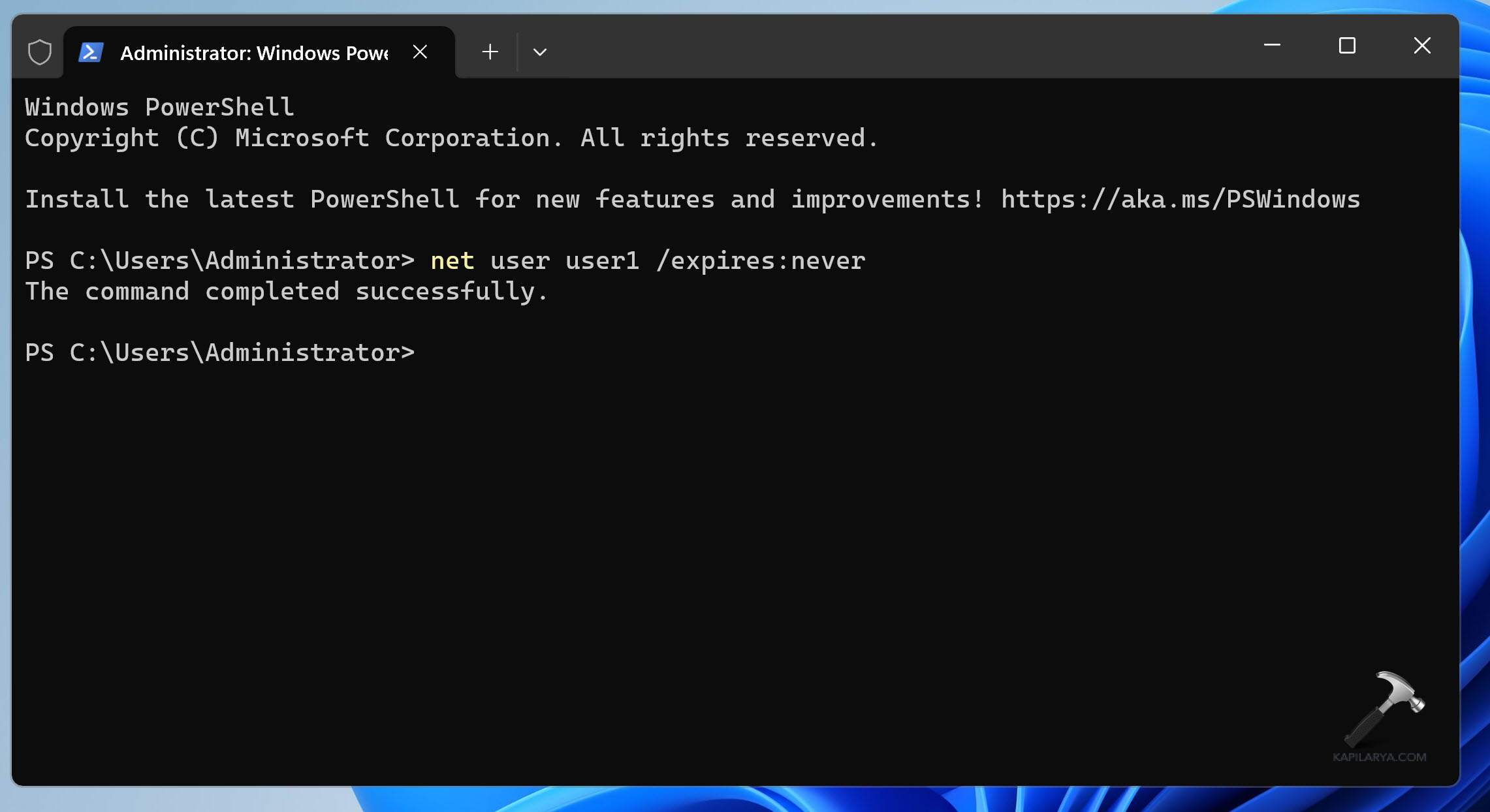 net user USERNAME /expires:never*HelyettesFelhasználónéva tényleges felhasználói fiók nevével.