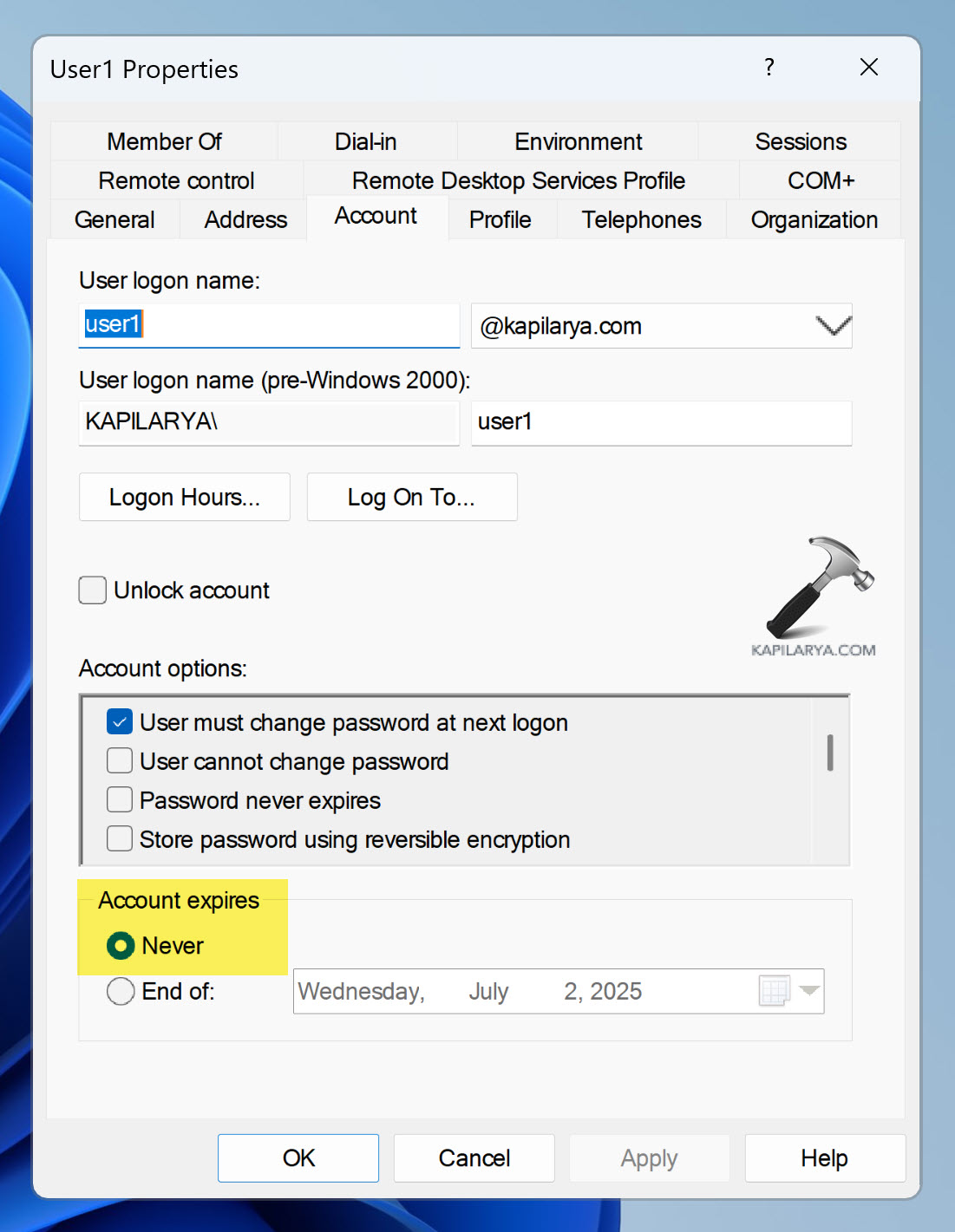 Vegye figyelembe, hogy ez azért történik, mert a felhasználói fiókok lejárnak, és a jelszó lejártától eltérő dolog. A jelszó konfigurációja arra kéri a felhasználókat, hogy állítsanak be egy új jelszót egy adott lejárati idő után. A felhasználók önmagukban beállíthatnak egy új jelszót. Ha azonban a számla lejár, akkor csak egy adminisztrátor tudja kezelni.