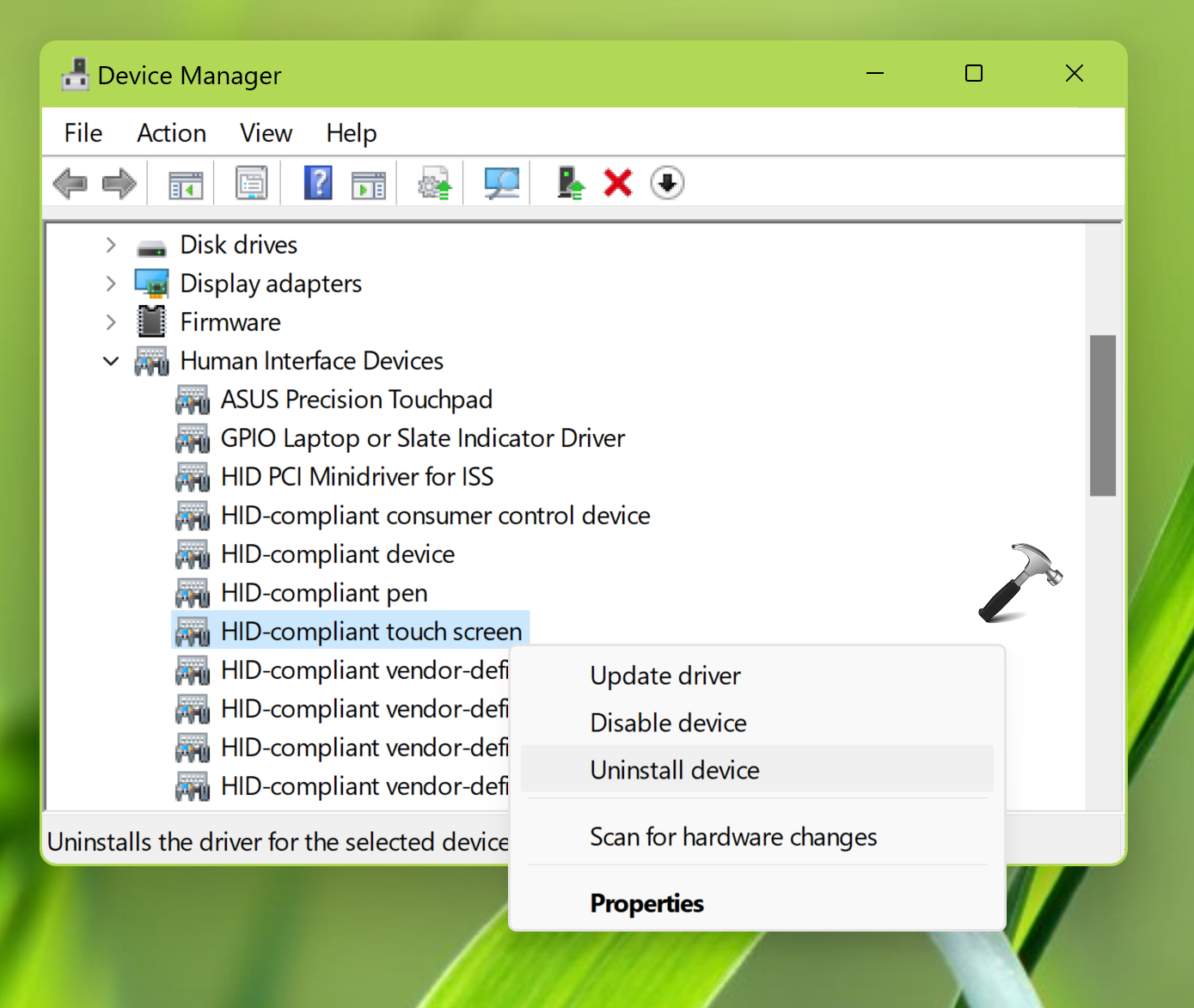 2. Ezután lépjen a Human Interface Devices elemre, kattintson a jobb gombbal a HID-kompatibilis érintőképernyőre, és válassza az Illesztőprogram eltávolítása lehetőséget.