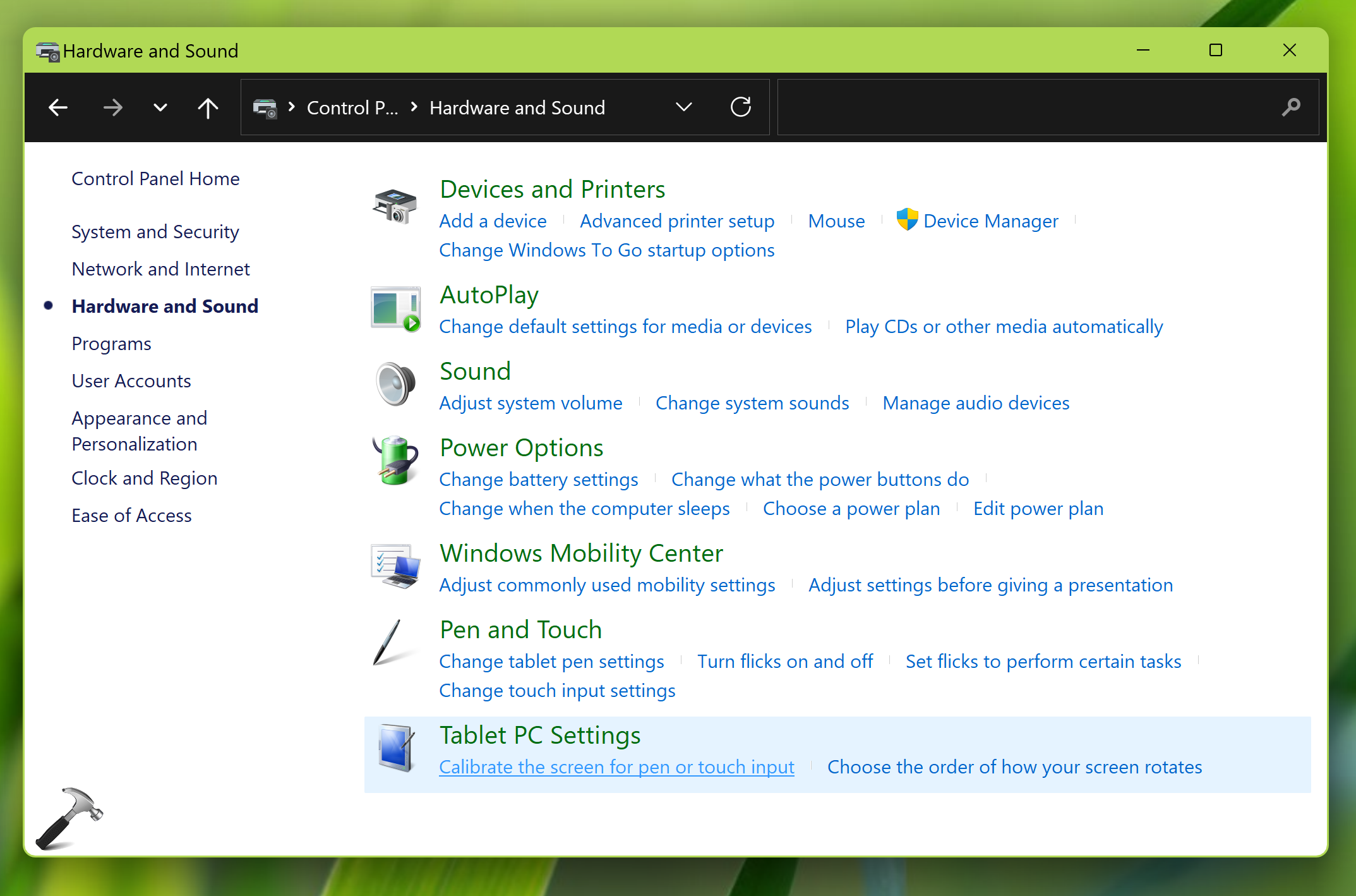 2. Lépjen a Nézet: Kategória elemre, és kattintson a Képernyő kalibrálása tollhoz vagy érintési ponthoz a Táblaszámítógép beállításai alatt.